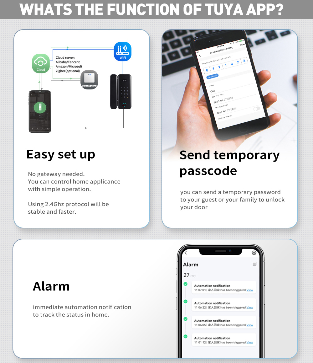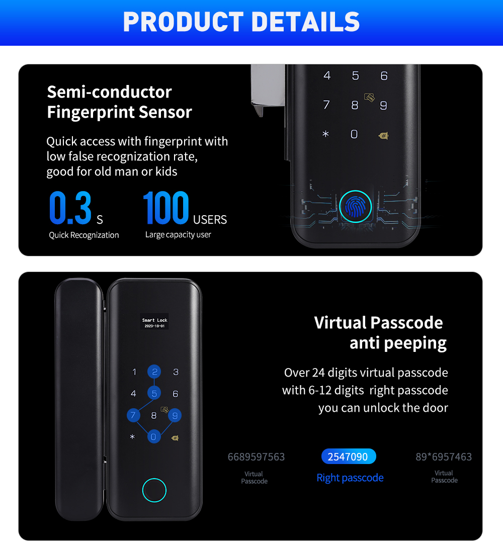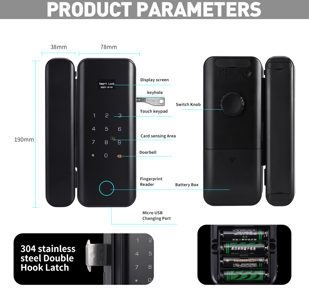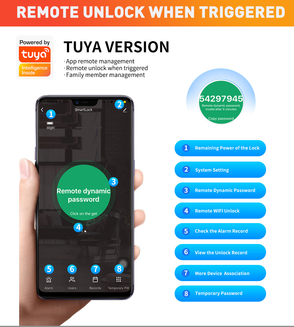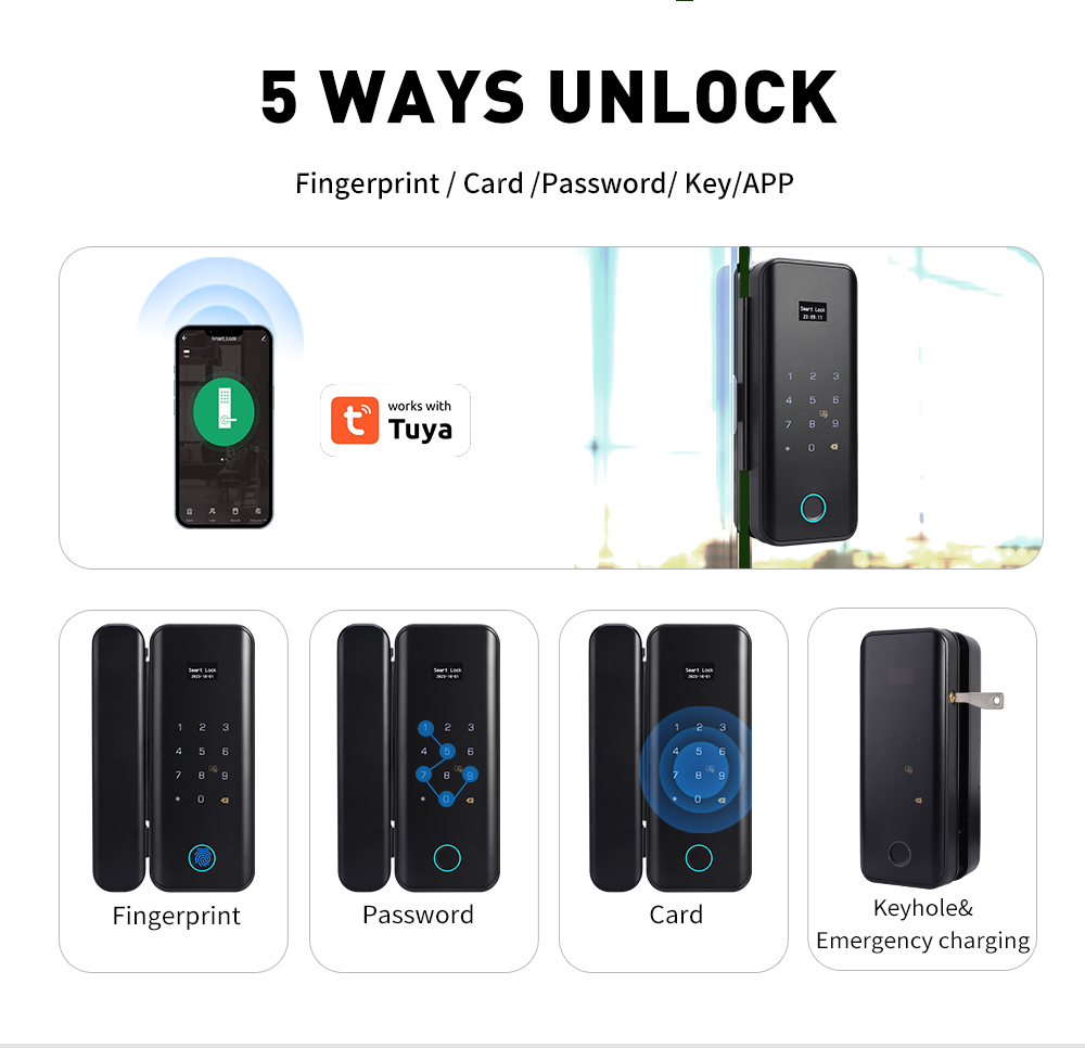 Unlock Modes: Fingerprint, password, IC card, code, Key, Tuya App, Remote controller (optional)